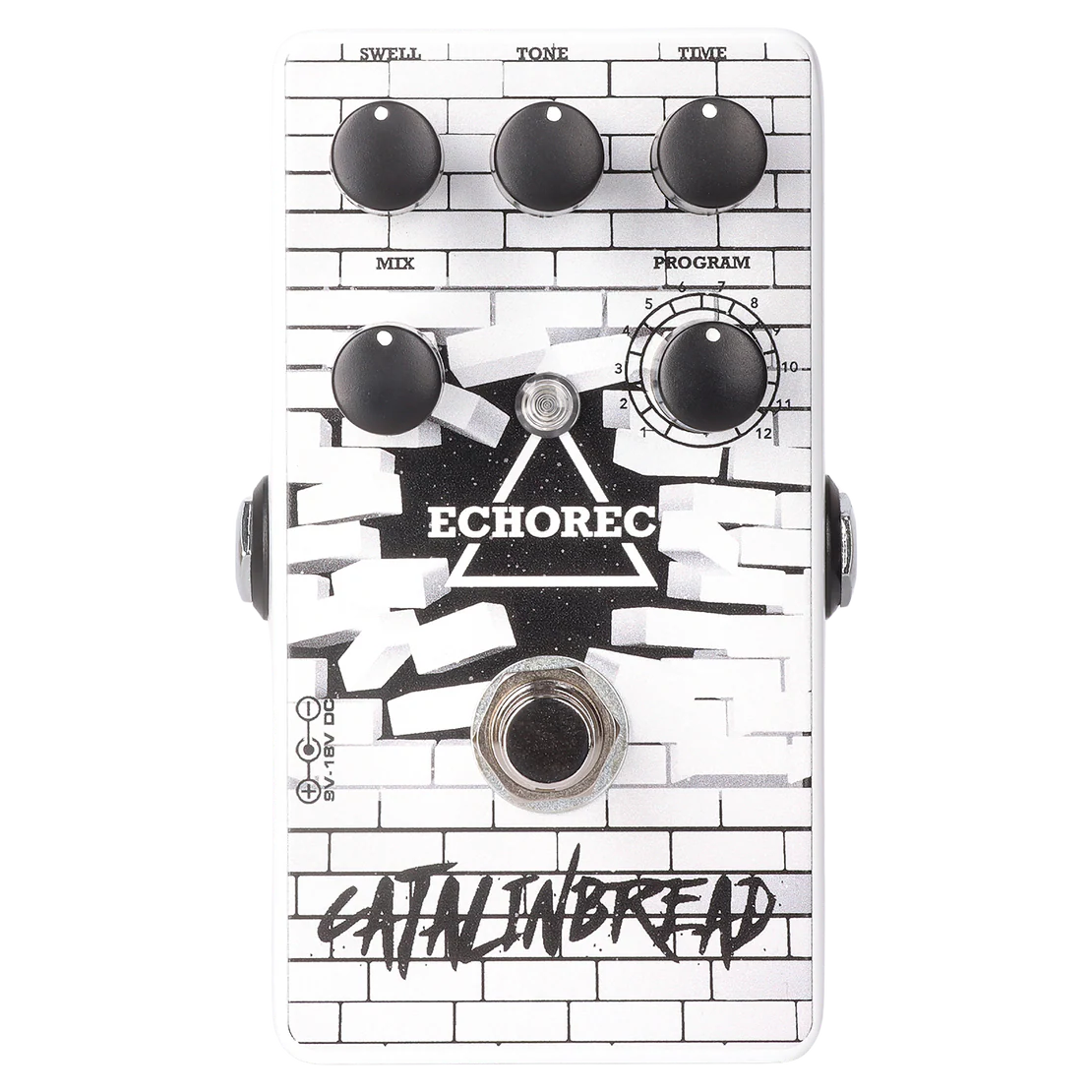 Para alimentar o Echorec, use uma fonte de alimentação DC de 9 a 18 volts com terra negativa, capaz de fornecer no mínimo 70mA.
